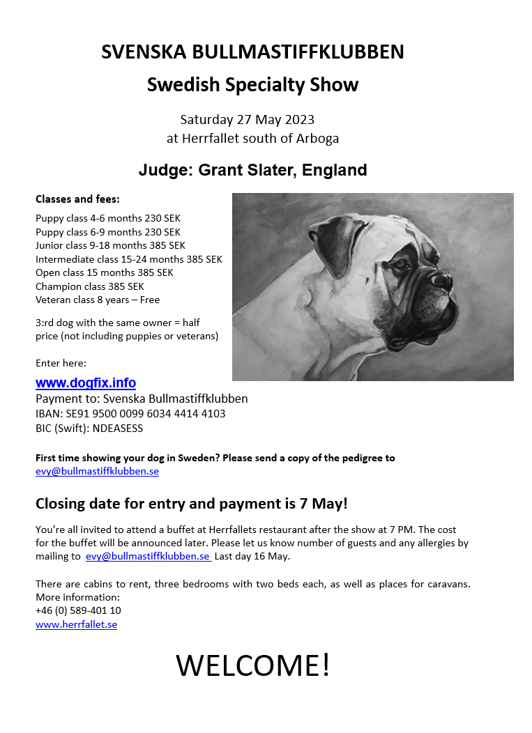 Svenska Bullmastiffklubben – Swedish Specialty Show20.4.20234.7.2024 Linkki ilmoittautumiseen: https://www.dogfix.info/?page_id=323